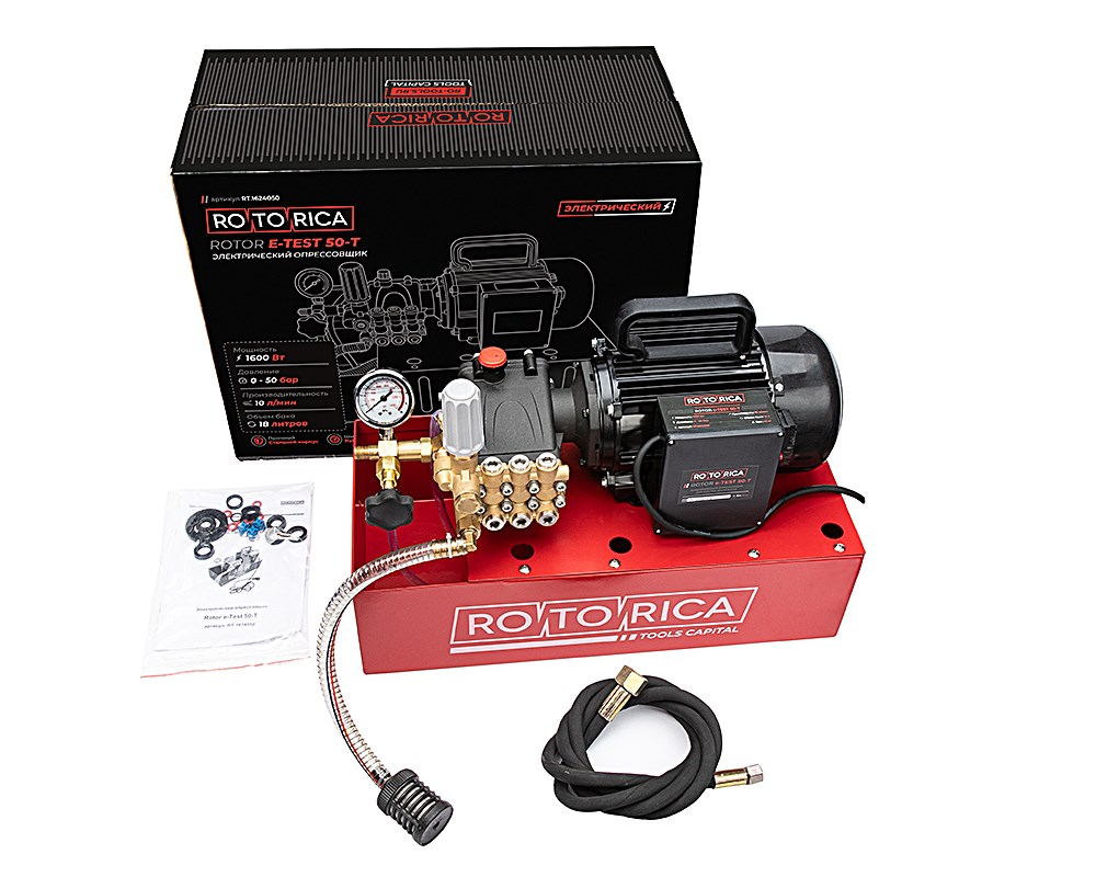 Электрический опрессовщик Rotor e-Test 50-Т предназначен для точных и быстрых гидравлических испытаний на прочность и герметичность всех видов сосудов высокого давления, труб внутренних инженерных систем, противопожарных труб и всех видов приборов отопления, а также для технического обслуживания.